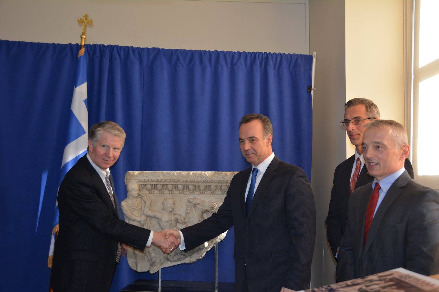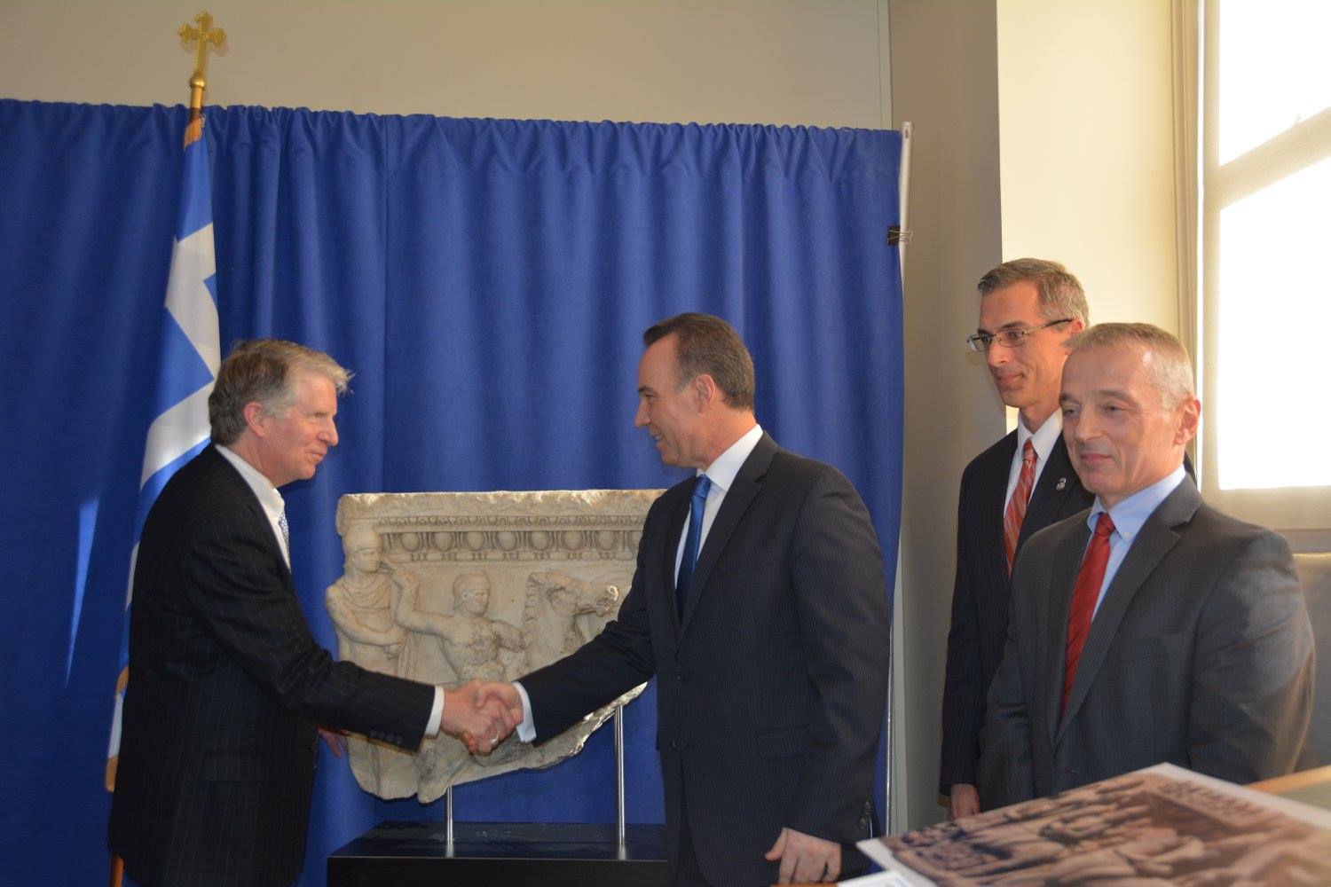 “Το τμήμα αυτό της μαρμάρινης σαρκοφάγου, το οποίο αναπαριστά μάχη μεταξύ Ελλήνων και Τρώων κατασχέθηκε με εντολή της Εισαγγελίας του Μανχάταν από την γκαλερί Royal-Athena Galleries. Ο επαναπατρισμός της σαρκοφάγου αποτελεί ένα μεγάλο και σημαντικό βήμα στις προσπάθειες που καταβάλλει η Ελλάδα για την προστασία και την αποκατάσταση της πολιτιστικής μας κληρονομιάς, που με παράνομο τρόπο έχει διοχετευτεί στο εξωτερικό και βρίσκεται είτε σε γκαλερί, όπως στη συγκεκριμένη περίπτωση, είτε σε ιδιωτικές συλλογές, είτε σε μουσεία είτε σε οίκους πώλησης αρχαιοτήτων. Ένα τεράστιο κομμάτι του πολιτιστικού μας παρελθόντος έχει λεηλατηθεί και θεωρώ ότι είναι καθήκον όλων των Ελλήνων απανταχού της γης να είναι ευαισθητοποιημένοι και σε εγρήγορση. Μας χαροποιεί ιδιαίτερα το γεγονός της εντόπισης αυτού του τμήματος της μαρμάρινης σαρκοφάγου, η οποία θα επαναπατριστεί τηρουμένων όλων των επίσημων διαδικασιών στη χώρα μας”.